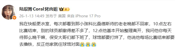 关于科比・桑德斯,小卡的中方经纪人烤肉姐曾分享过一件趣闻:她发现每次快船主场的比赛后,桑德斯总是最后一个才离开。追问下得知原来桑德斯每次比赛结束后都要在健身房待到12点以后,因为他家就住在球馆对面。